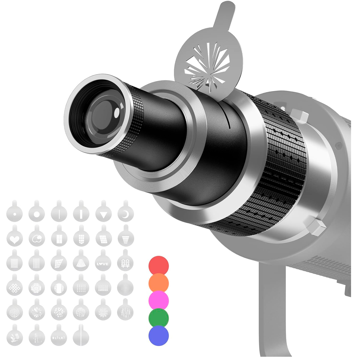 Soonpho Bowens Mount – Accesorio para proyector, proyector cónico óptico Snoot, kit de fotografía para estudio de fotografía, accesorio de iluminación con 5 filtros de color y 34 gobos para luz de 34 gobos y 5 filtros de color: el accesorio para proyector cuenta con 5 filtros de temperatura de color distintos (rojo, amarillo, azul, verde, rosa) y un conjunto de 34 gobos estampados (34 diseños distintos), lo que permite efectos de iluminación vibrantes ideales para iluminación gráfica en fotografía y videografía; Nota: Los gobos de patrón y los filtros de color se pueden utilizar en combinación o individualmente para lograr efectos de iluminación únicos, proporcionando más recursos creativos para fotografía.