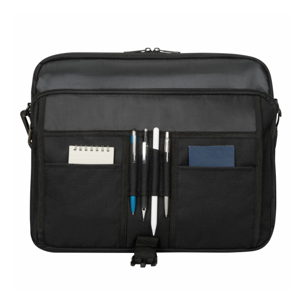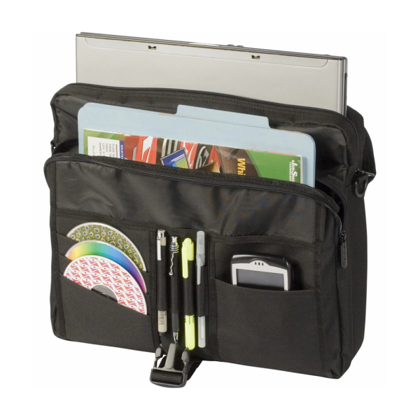 - Un espacio de trabajo comercial integral con todos los compartimentos que necesita para llevar archivos, tarjetas de presentación, llaves, unidades de almacenamiento y otros artículos esenciales para llevar.