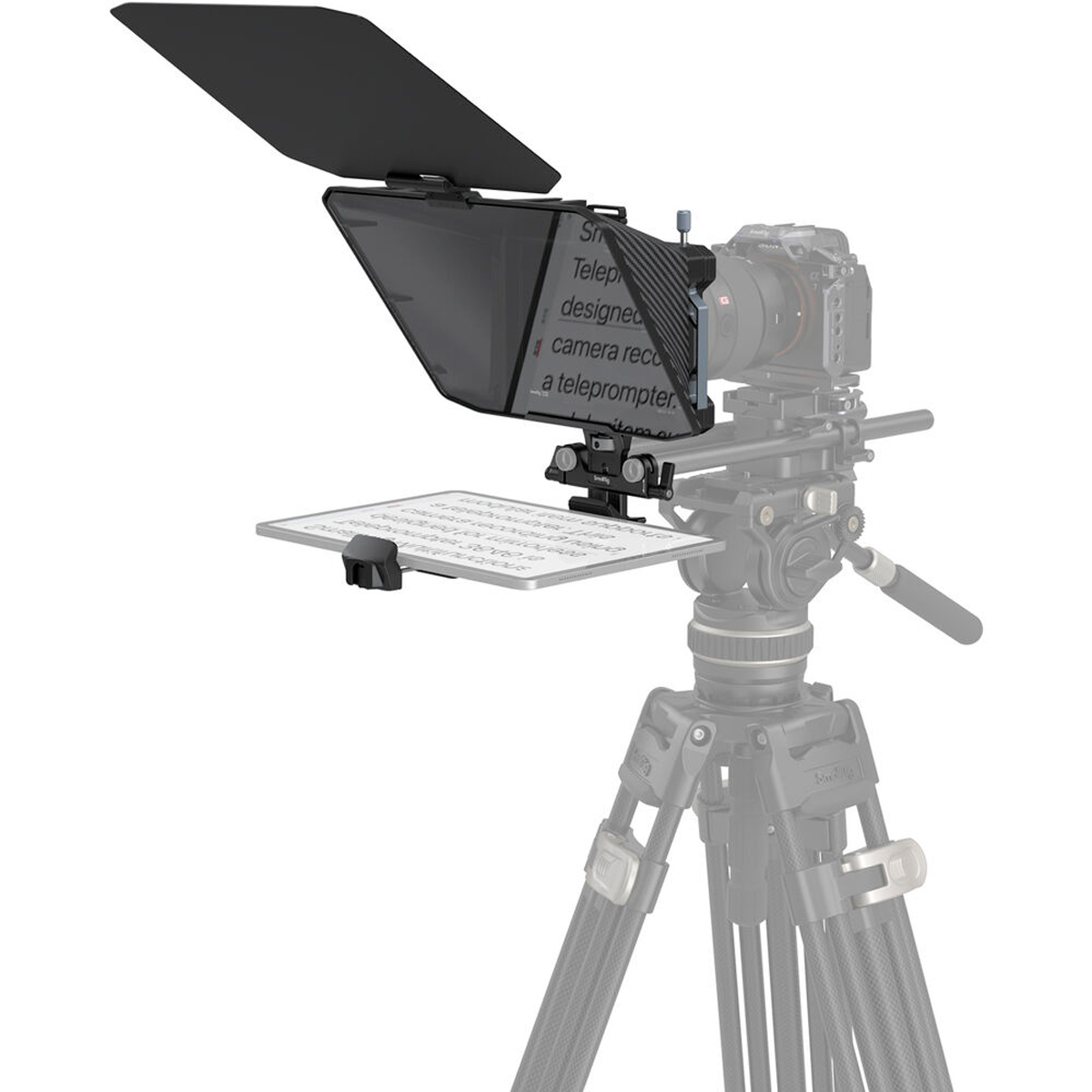 Grabe contenido con guión con su tableta o cámara sin espejo utilizando el teleprompter multifuncional SmallRig gracias a los accesorios de montaje incluidos. La abrazadera para tableta puede acomodar dispositivos de hasta 11″ de ancho, mientras que la abrazadera posterior y la cubierta de silicona para lentes cuentan con aberturas para lentes con diámetros exteriores de 22 a 95 mm. Una superficie de apoyo al vidrio, una bandera superior ajustable y un marco de filtro de 4 x 5,65″ garantizan su La escritura es visible desde una distancia de hasta 16′.