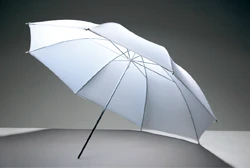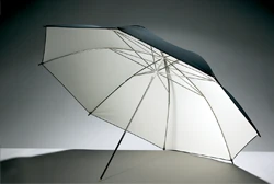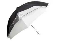 Paraguas doble capa, negro por fuera, plateado por dentro, de 40″ / 101 cm, para estudio fotográfico. Su superficie interna plateada minimiza la perdida de luz, mientras maximiza a dispersión uniforme de la misma.