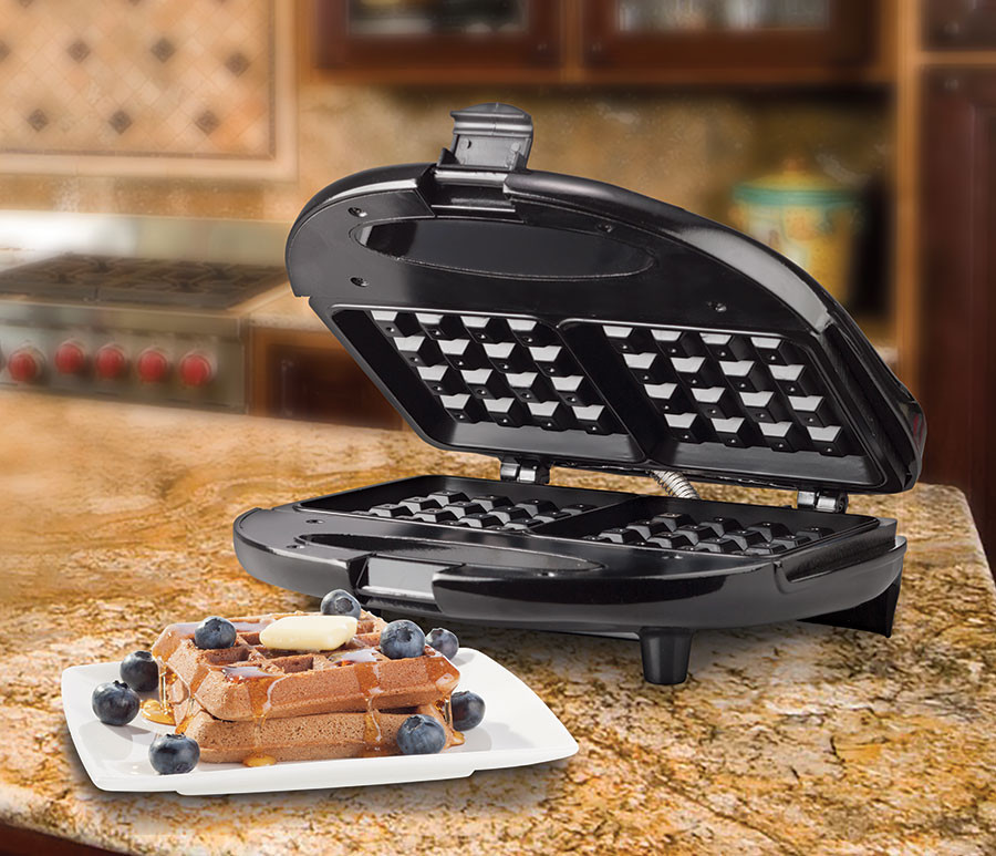 Waflera doble antiadherente 750 vatios cocina dos gofres perfectos en 6-10 minutos. Los waffles se deslizan directamente de las placas antiadherentes faciles de limpiar. Practicas luces indicadoras de energia.